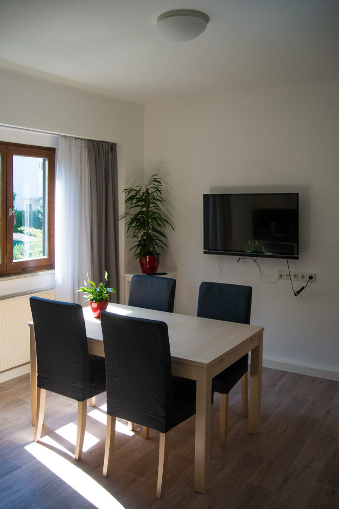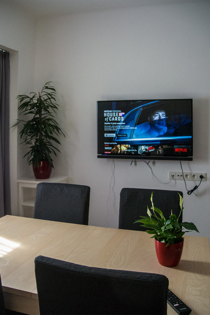 - 1 HD-Smart-TV mit LAN-Anschluss (Netflix), Fernbedienung und Wandhalter